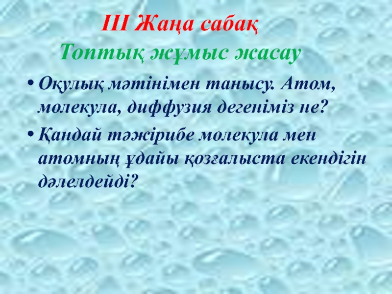 ІІІ Жаңа сабақ Топтық жұмыс жасауОқулық мәтінімен танысу. Атом, молекула, диффузия дегеніміз не?Қандай тәжірибе молекула мен атомның