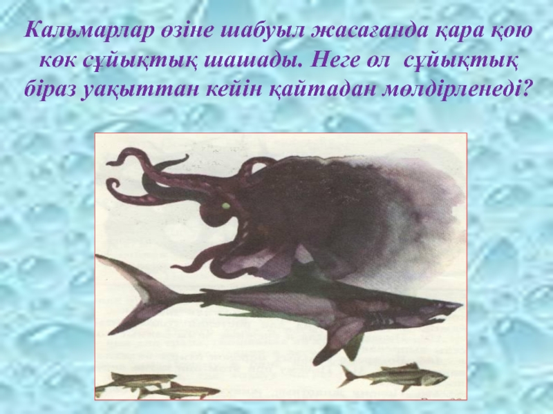 Слайд 20Кальмарлар өзіне шабуыл жасағанда қара қою көк сұйықтық шашады. Неге ол