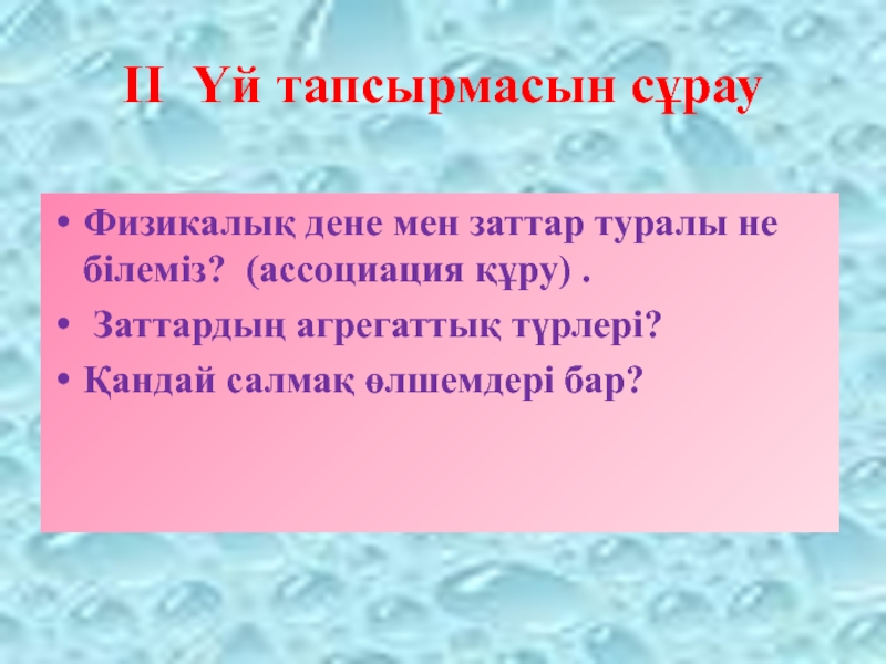 ІІ Үй тапсырмасын сұрауФизикалық дене мен заттар туралы не білеміз? (ассоциация құру) . Заттардың агрегаттық түрлері?Қандай салмақ