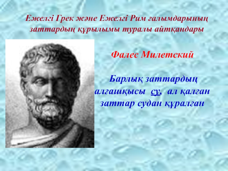 Ежелгі Грек және Ежелгі Рим ғалымдарының заттардың құрылымы туралы айтқандарыФалес Милетский Барлық заттардың алғашқысы су, ал қалған