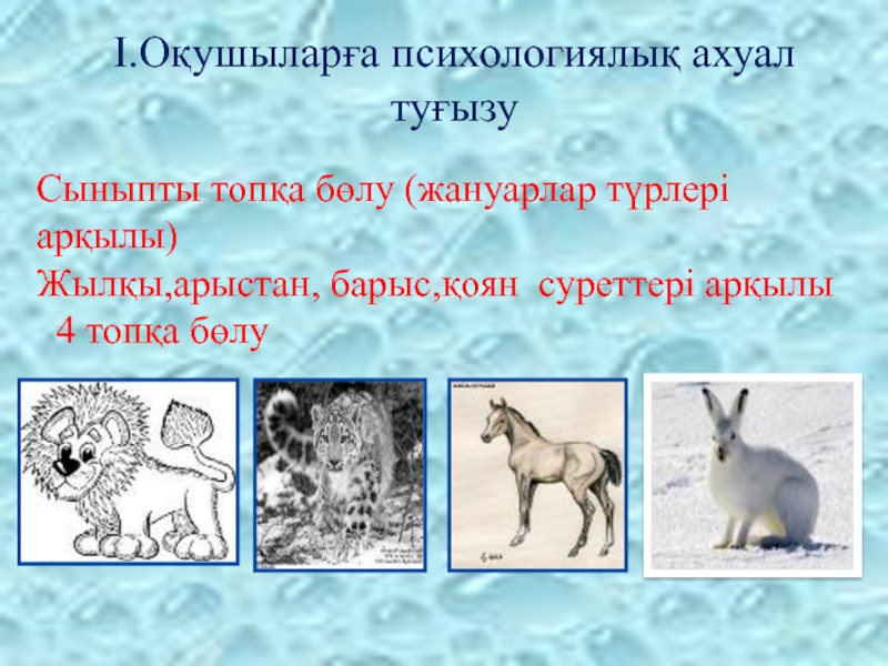 І.Оқушыларға психологиялық ахуал туғызуСыныпты топқа бөлу (жануарлар түрлері арқылы)Жылқы,арыстан, барыс,қоян суреттері арқылы  4 топқа бөлу