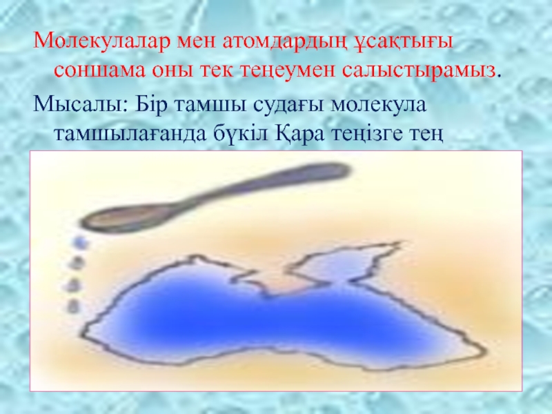 Молекулалар мен атомдардың ұсақтығы соншама оны тек теңеумен салыстырамыз. Мысалы: Бір тамшы судағы молекула тамшылағанда бүкіл Қара