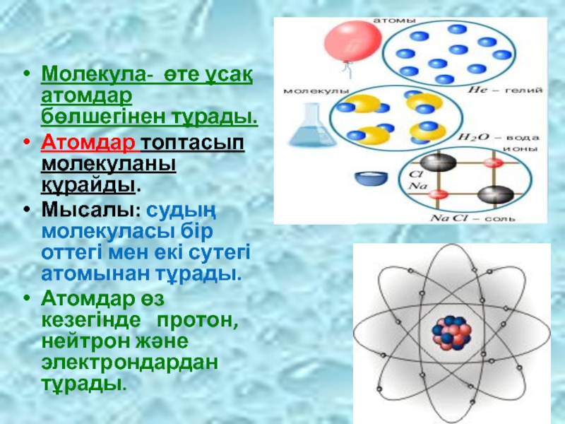 Молекула- өте ұсақ атомдар бөлшегінен тұрады.Атомдар топтасып молекуланы құрайды. Мысалы: судың молекуласы бір оттегі мен екі сутегі