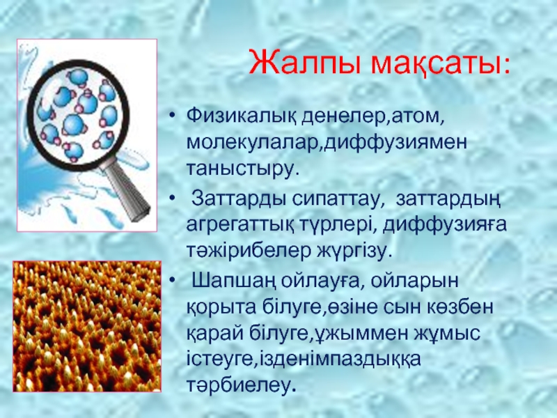 Жалпы мақсаты:Физикалық денелер,атом, молекулалар,диффузиямен таныстыру. Заттарды сипаттау, заттардың агрегаттық түрлері, диффузияға тәжірибелер жүргізу. Шапшаң ойлауға, ойларын қорыта