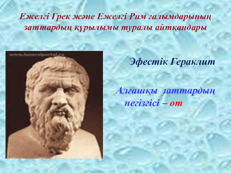 Ежелгі Грек және Ежелгі Рим ғалымдарының заттардың құрылымы туралы айтқандарыЭфестік Гераклит Алғашқы заттардың негізгісі – от