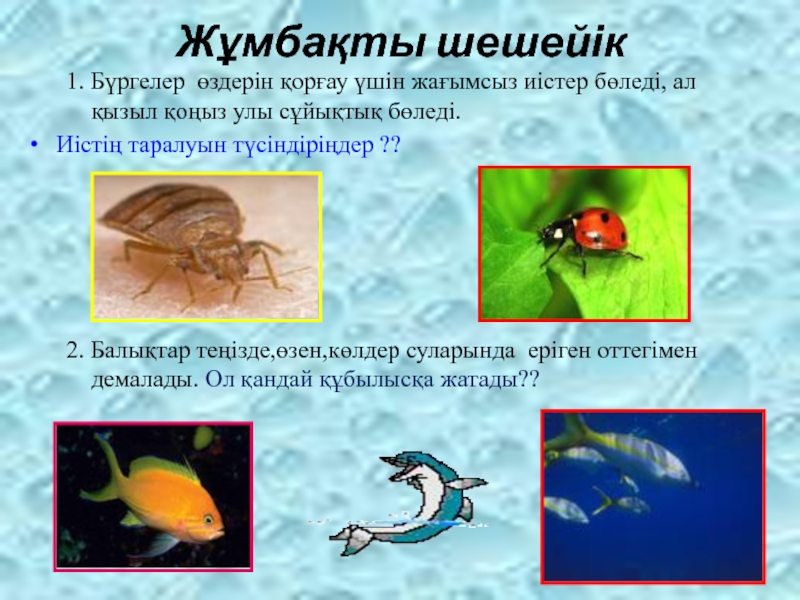 Жұмбақты шешейік1. Бүргелер өздерін қорғау үшін жағымсыз иістер бөледі, ал қызыл қоңыз улы сұйықтық бөледі.Иістің таралуын түсіндіріңдер