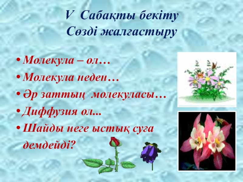 V Сабақты бекіту Сөзді жалғастыруМолекула – ол…Молекула неден…Әр заттың молекуласы…Диффузия ол...Шайды неге ыстық суға  демдейді?
