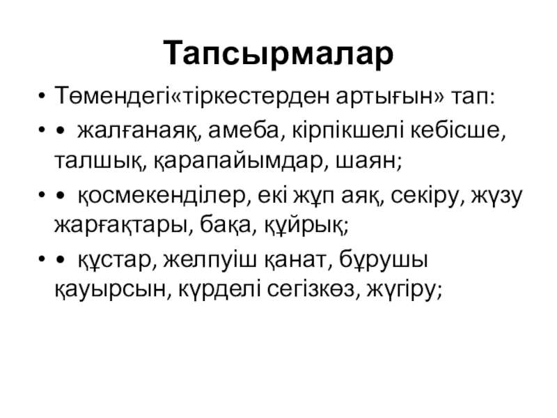 ТапсырмаларТөмендегі«тіркестерден артығын» тап:• жалғанаяқ, амеба, кірпікшелі кебісше, талшық, қарапайымдар, шаян;• қосмекенділер, екі жұп аяқ, секіру, жүзу жарғақтары,