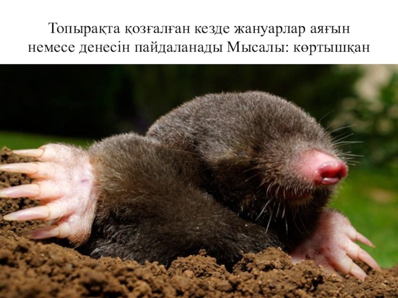 Слайд 15Топырақта қозғалған кезде жануарлар аяғын немесе денесін пайдаланады Мысалы: көртышқан
