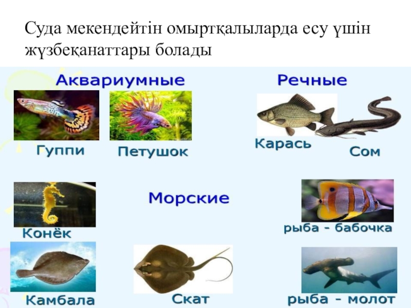 Слайд 5Суда мекендейтін омыртқалыларда есу үшін жүзбеқанаттары болады