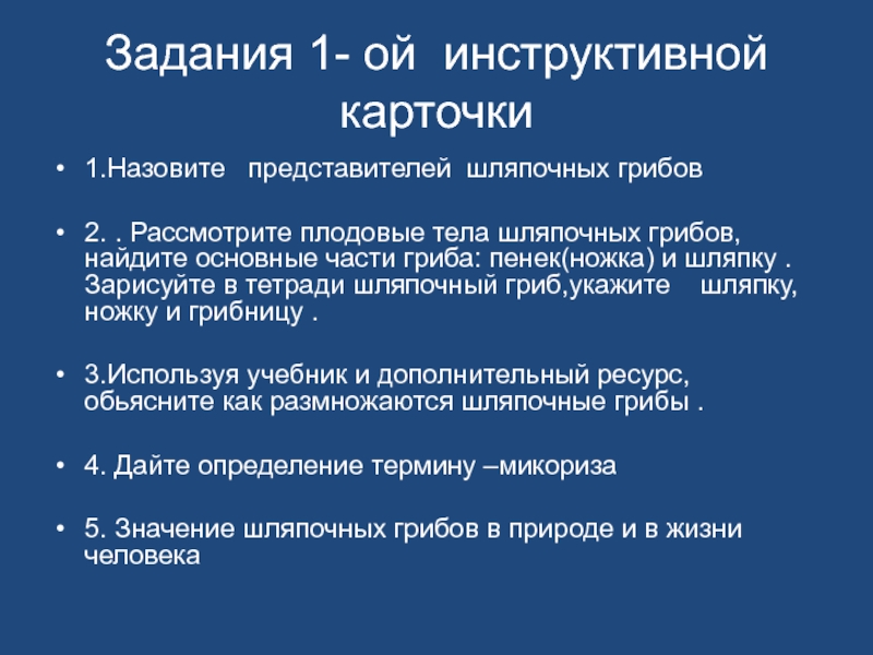 Задания 1- ой инструктивной карточки1.Назовите  представителей шляпочных грибов2. . Рассмотрите плодовые тела шляпочных грибов, найдите основные