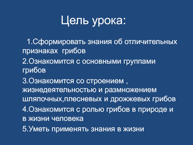 Цель урока: 1.Сформировать знания об отличительных признаках грибов2.Ознакомится с основными группами грибов3.Ознакомится со строением ,жизнедеятельностью и размножением шляпочных,плесневых и дрожжевых грибов 4.Ознакомится с ролью грибов в природе и в жизни человека 5.Уметь применять знания в жизни