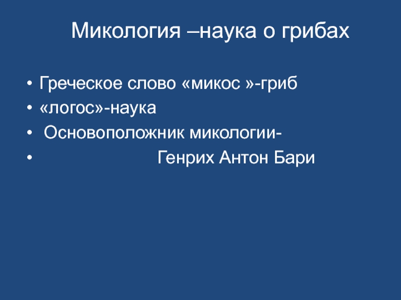 Микология –наука о грибах  Греческое слово «микос »-гриб«логос»-наука Основоположник микологии-