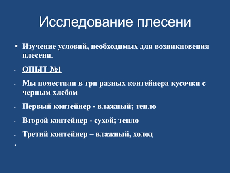 Исследование плесени Изучение условий, необходимых для возникновения плесени. ОПЫТ №1Мы поместили в три разных контейнера кусочки с