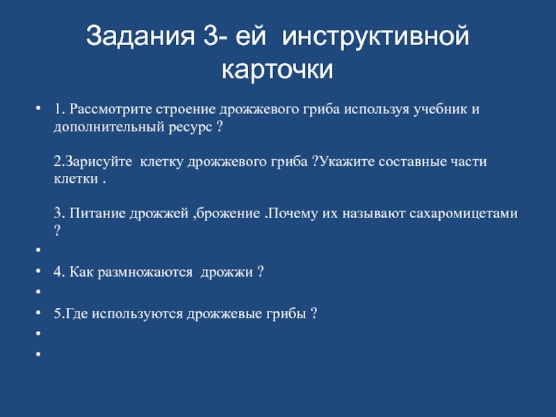 Задания 3- ей инструктивной карточки1. Рассмотрите строение дрожжевого гриба используя учебник и дополнительный ресурс ?  2.Зарисуйте