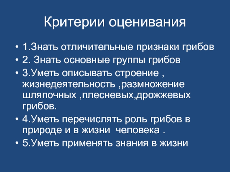 Критерии оценивания 1.Знать отличительные признаки грибов2. Знать основные группы грибов 3.Уметь описывать строение ,жизнедеятельность ,размножение шляпочных ,плесневых,дрожжевых