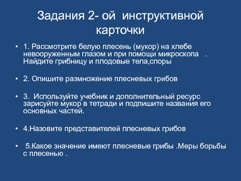 Задания 2- ой инструктивной карточки1. Рассмотрите белую плесень (мукор) на хлебе невооруженным глазом и при помощи микроскопа