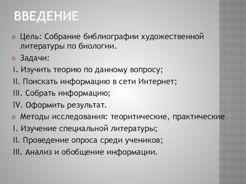 проектом мной обработана информация о различных книгах, которые входят в раздел художественной литературы, содержащей различную биологическую информацию. Результатом моей работы является библиографический список и диск с закаченными книгами.