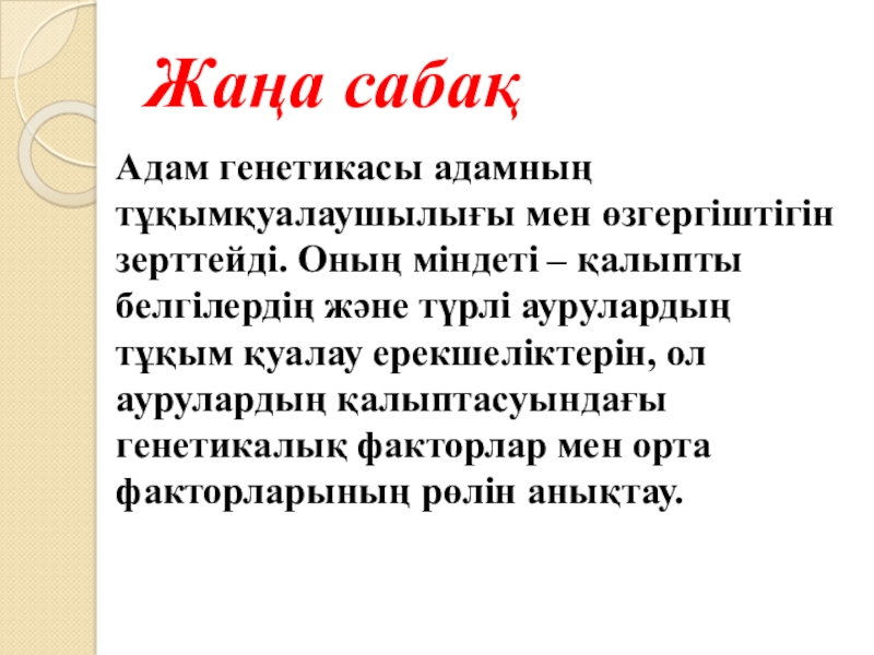 қалыпты белгілердің және түрлі аурулардың тұқым қуалау ерекшеліктерін, ол аурулардың қалыптасуындағы генетикалық факторлар мен орта факторларының рөлін анықтау.