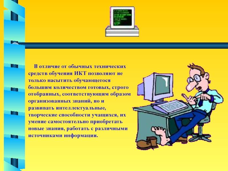 Слайд 11 В отличие от обычных технических средств обучения ИКТ позволяют