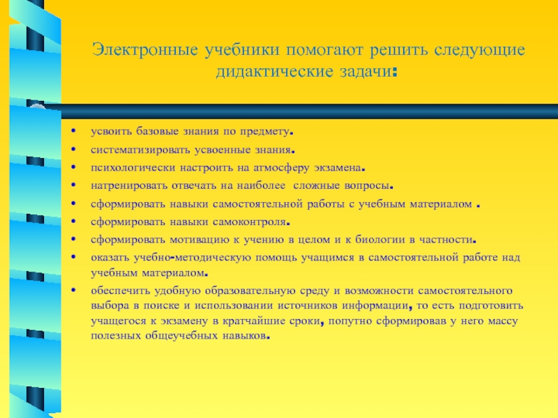 Слайд 12 Электронные учебники помогают решить следующие дидактические задачи: