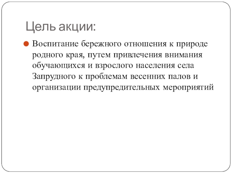Цель акции:Воспитание бережного отношения к природе родного края, путем привлечения внимания обучающихся и взрослого населения села Запрудного к проблемам весенних палов и организации предупредительных мероприятий