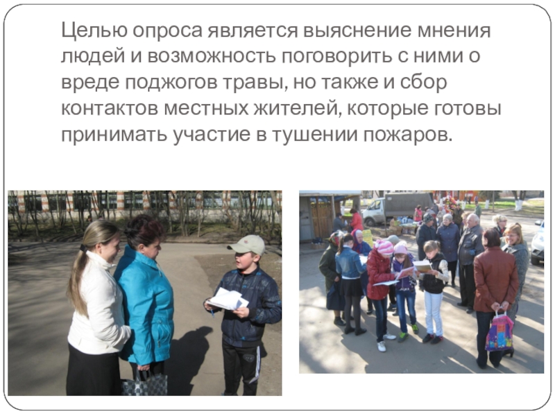 Целью опроса является выяснение мнения людей и возможность поговорить с ними о вреде поджогов травы, но также