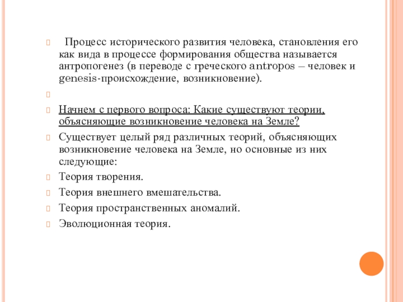 Слайд 2 Процесс исторического развития человека, становления его как вида в процессе