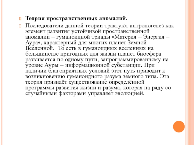 пространственной аномалии – гуманоидной триады «Материя – Энергия – Аура», характерный для многих планет Земной Вселенной. То есть в гуманоидных вселенных на большинстве пригодных для жизни планет биосфера развивается по одному пути, запрограммированному на уровне Ауры – информационной субстанции. При наличии благоприятных условий этот путь приводит к возникновению гуманоидного разума земного типа. Эта теория признаёт существование определённой программы развития жизни и разума, которая на ряду со случайными факторами управляет эволюцией.
