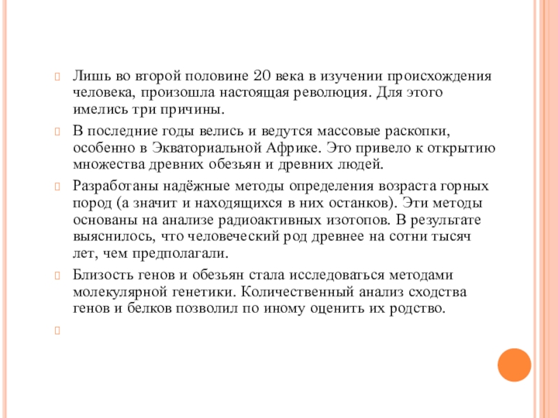 Слайд 7Лишь во второй половине 20 века в изучении происхождения человека, произошла