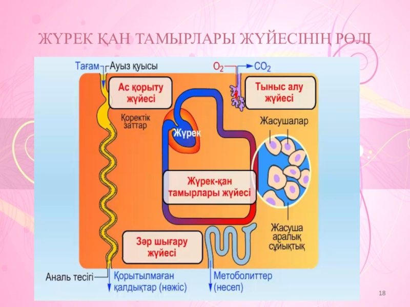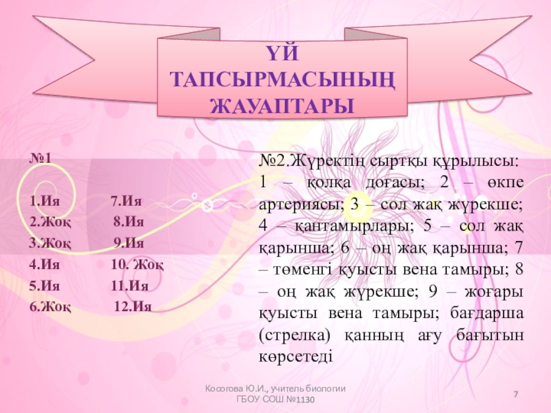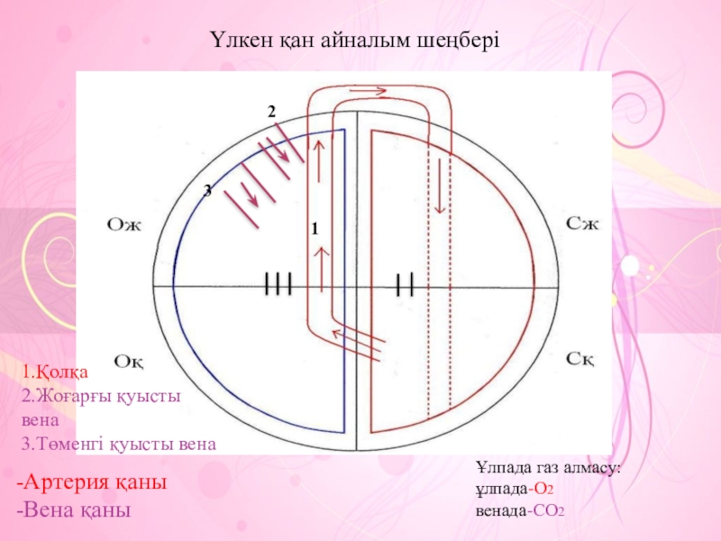 1 – қолқа доғасы; 2 – өкпе артериясы; 3 – сол жақ жүрекше; 4 – қантамырлары; 5 – сол жақ қарынша; 6 – оң жақ қарынша; 7 – төменгі қуысты вена тамыры; 8 – оң жақ жүрекше; 9 – жоғары қуысты вена тамыры; бағдарша (стрелка) қанның ағу бағытын көрсетеді