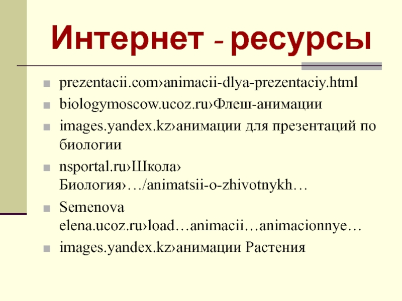 Интернет - ресурсыprezentacii.com›animacii-dlya-prezentaciy.htmlbiologymoscow.ucoz.ru›Флеш-анимацииimages.yandex.kz›анимации для презентаций по биологииnsportal.ru›Школа›Биология›…/animatsii-o-zhivotnykh…Semenova elena.ucoz.ru›load…animacii…animacionnye…images.yandex.kz›анимации Растения