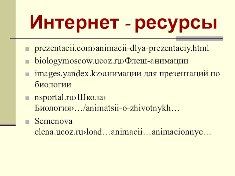 Интернет - ресурсыprezentacii.com›animacii-dlya-prezentaciy.htmlbiologymoscow.ucoz.ru›Флеш-анимацииimages.yandex.kz›анимации для презентаций по биологииnsportal.ru›Школа›Биология›…/animatsii-o-zhivotnykh…Semenova elena.ucoz.ru›load…animacii…animacionnye…