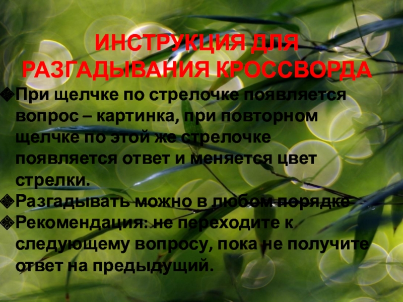 ИНСТРУКЦИЯ ДЛЯ РАЗГАДЫВАНИЯ КРОССВОРДАПри щелчке по стрелочке появляется вопрос – картинка, при повторном щелчке по этой же стрелочке появляется ответ и меняется цвет стрелки.Разгадывать можно в любом порядкеРекомендация: не переходите к следующему вопросу, пока не получите