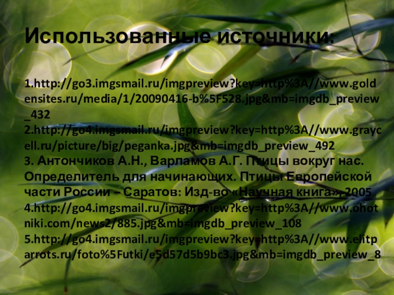 Использованные источники:1.http://go3.imgsmail.ru/imgpreview?key=http%3A//www.goldensites.ru/media/1/20090416-b%5F528.jpg&mb=imgdb_preview_4322.http://go4.imgsmail.ru/imgpreview?key=http%3A//www.graycell.ru/picture/big/peganka.jpg&mb=imgdb_preview_4923. Антончиков А.Н., Варламов А.Г. Птицы вокруг нас. Определитель для начинающих. Птицы Европейской части России –