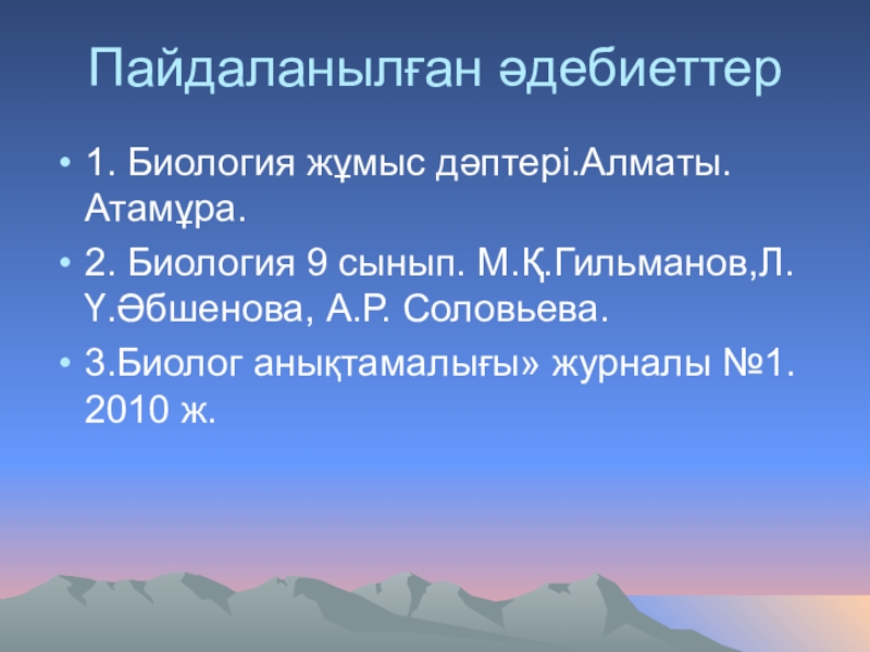 Пайдаланылған әдебиеттер1. Биология жұмыс дәптері.Алматы. Атамұра.2. Биология 9 сынып. М.Қ.Гильманов,Л.Ү.Әбшенова, А.Р. Соловьева.3.Биолог анықтамалығы» журналы №1. 2010 ж.