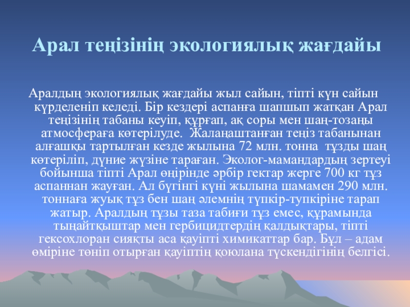 Арал теңізінің экологиялық жағдайыАралдың экологиялық жағдайы жыл сайын, тіпті күн сайын күрделеніп келеді. Бір кездері аспанға шапшып