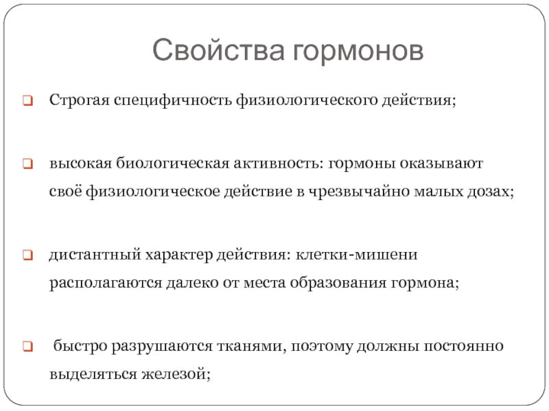 Свойства гормоновСтрогая специфичность физиологического действия;высокая биологическая активность: гормоны оказывают своё физиологическое действие в чрезвычайно малых дозах;дистантный характер