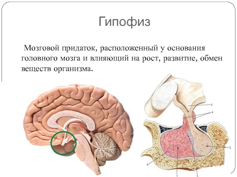 Гипофиз   Мозговой придаток, расположенный у основания головного мозга и влияющий на рост, развитие, обмен веществ
