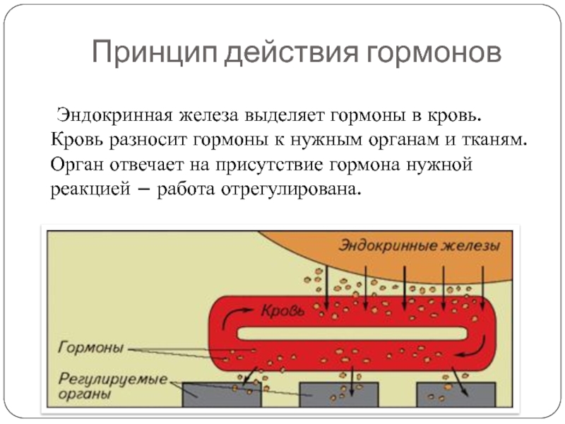 Принцип действия гормонов  Эндокринная железа выделяет гормоны в кровь. Кровь разносит гормоны к нужным органам и