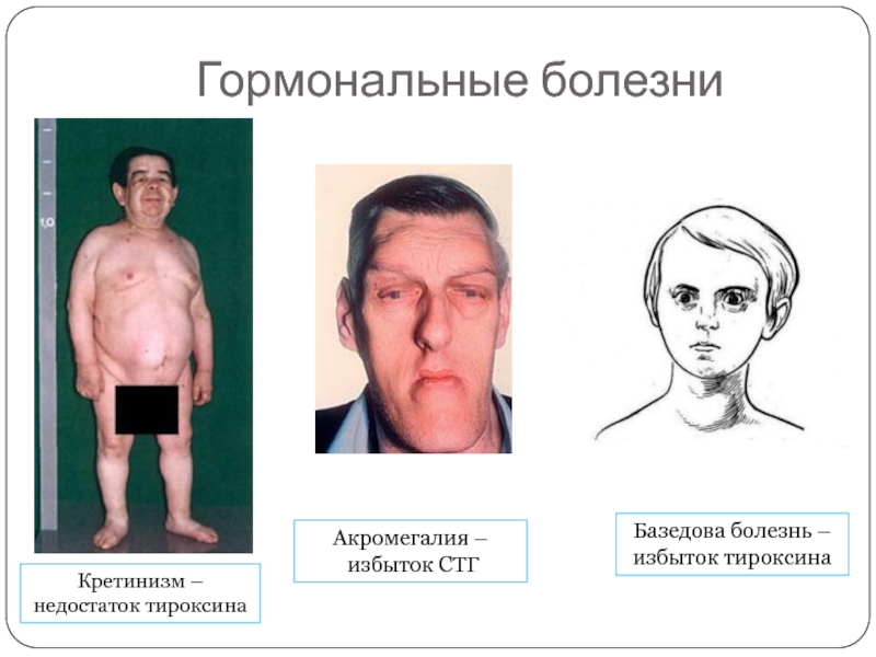 Гормональные болезниКретинизм – недостаток тироксинаАкромегалия – избыток СТГБазедова болезнь – избыток тироксина