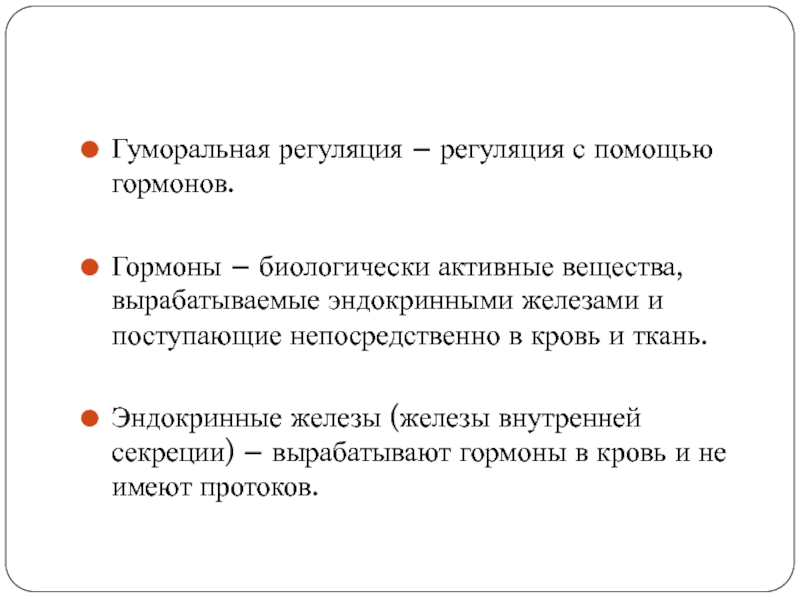 Гуморальная регуляция – регуляция с помощью гормонов.Гормоны – биологически активные вещества, вырабатываемые эндокринными железами и поступающие непосредственно в кровь и ткань.Эндокринные железы (железы внутренней секреции) – вырабатывают гормоны в кровь и не имеют протоков.