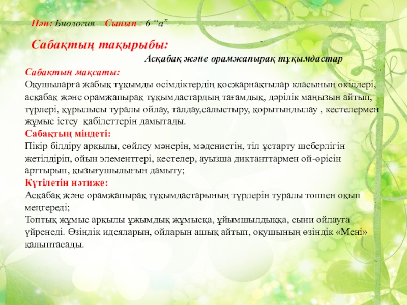 Оқушыларға жабық тұқымды өсімдіктердің қосжарнақтылар класының өкілдері, асқабақ және орамжапырақ тұқымдастардың тағамдық, дәрілік маңызын айтып, түрлері, құрылысы туралы ойлау, талдау,салыстыру, қорытындылау , кестелермен жұмыс істеу қабілеттерін дамытады.