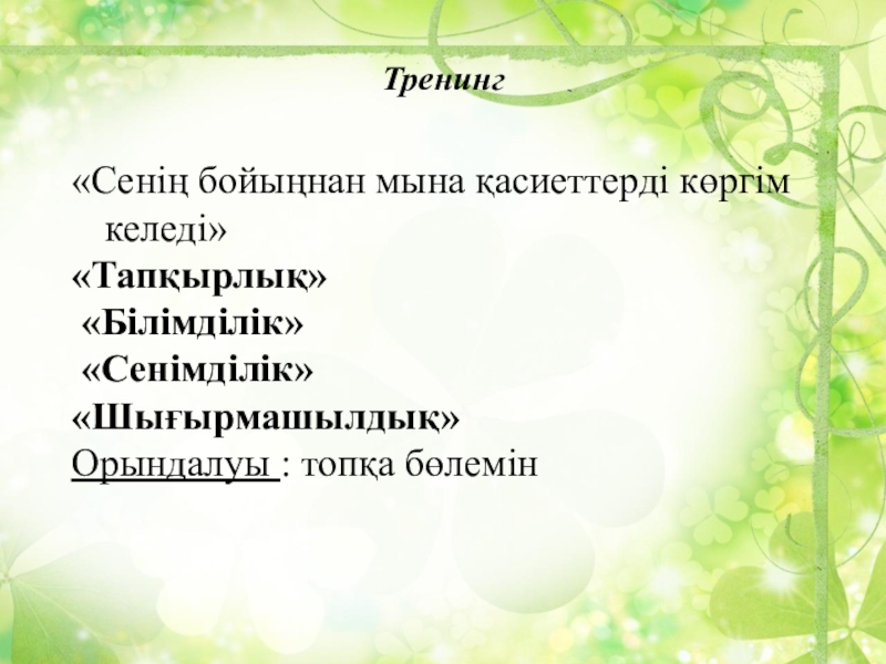 Топтық жұмыс арқылы ұжымдық жұмысқа, ұйымшылдыққа, сыни ойлауға үйренеді. Өзіндік идеяларын, ойларын ашық айтып, оқушының өзіндік «Мені» қалыптасады.