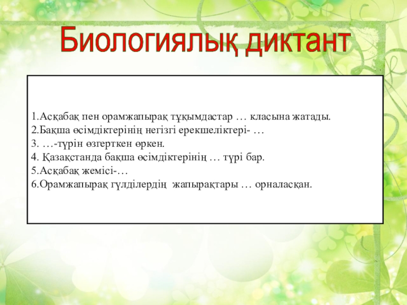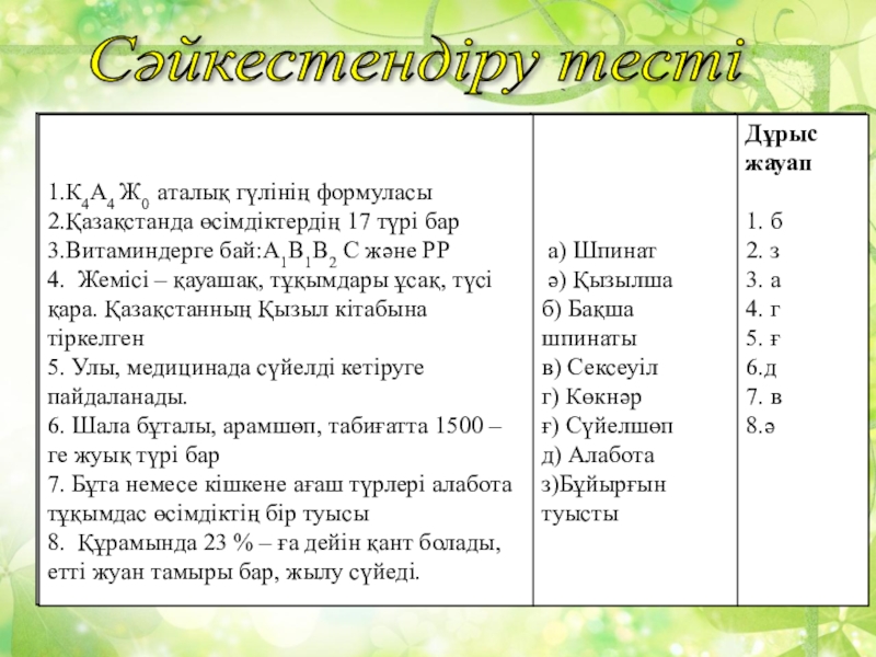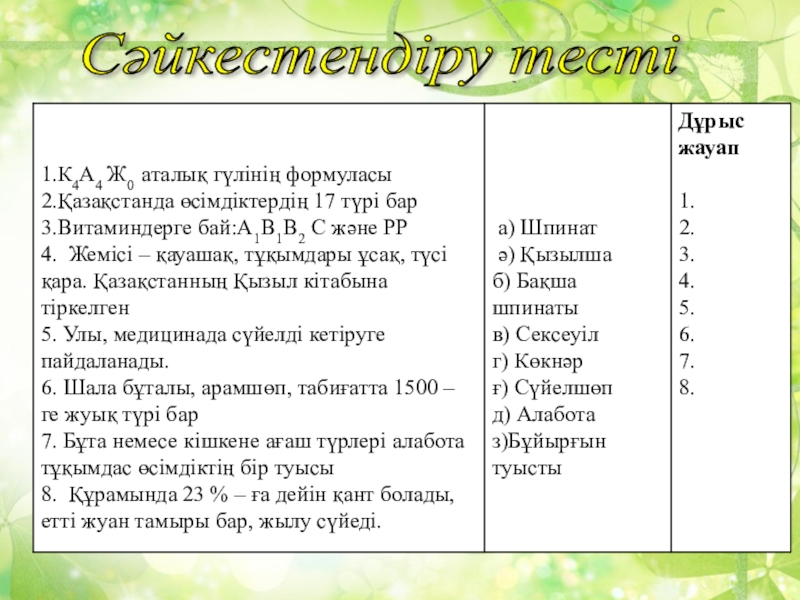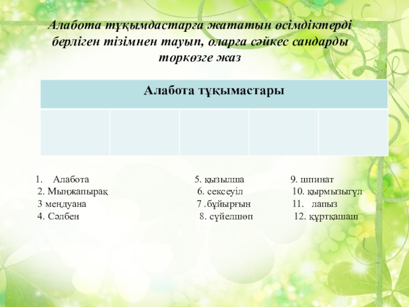 Алабота тұқымдастарға жататын өсімдіктерді берліген тізімнен тауып, оларға сәйкес сандарды торкөзге жаз