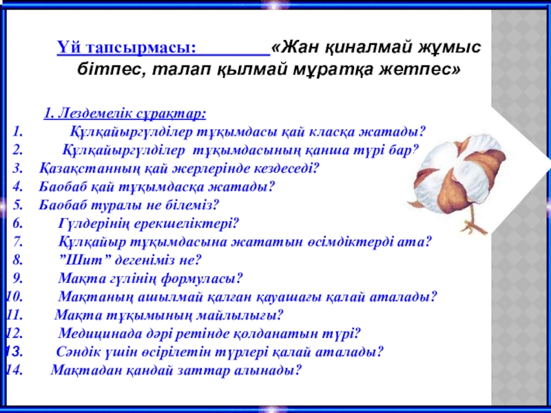 Үй тапсырмасы: «Жан қиналмай жұмыс бітпес, талап қылмай мұратқа жетпес»