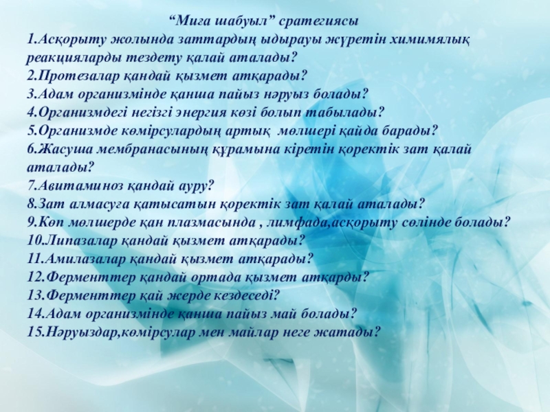 1.Асқорыту жолында заттардың ыдырауы жүретін химимялық реакцияларды тездету қалай аталады?