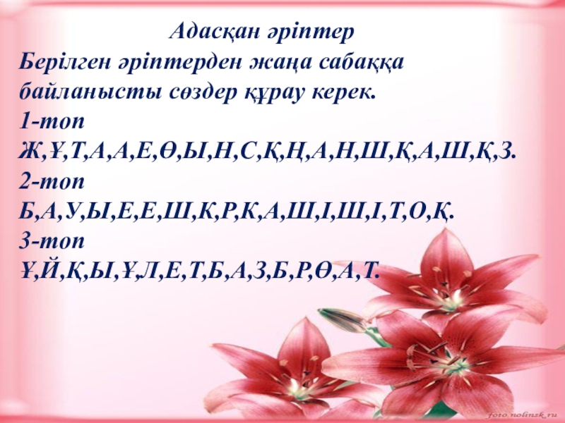 Берілген әріптерден жаңа сабаққа байланысты сөздер құрау керек.