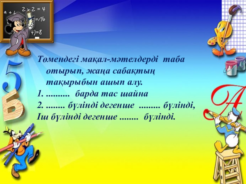 Слайд 4Төмендегі мақал-мәтелдерді таба отырып, жаңа сабақтың тақырыбын ашып алу.
