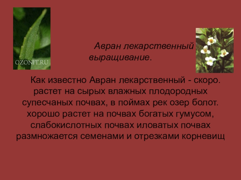 Как известно Авран лекарственный - скоро. растет на сырых влажных плодородных супесчаных почвах, в поймах рек озер болот. хорошо растет на почвах богатых гумусом, слабокислотных почвах иловатых почвах размножается семенами и отрезками корневищ